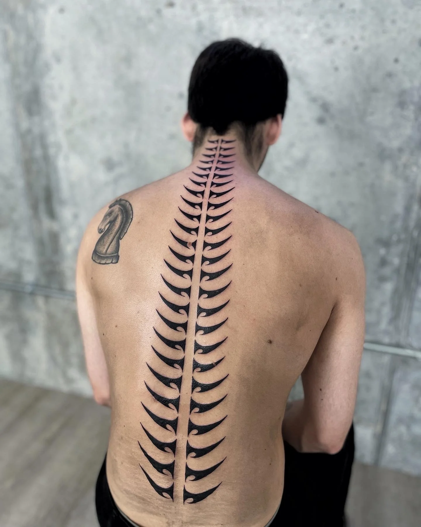Loz's work combines fine lines with large areas of solid black to create tattoos that are bold yet refined.